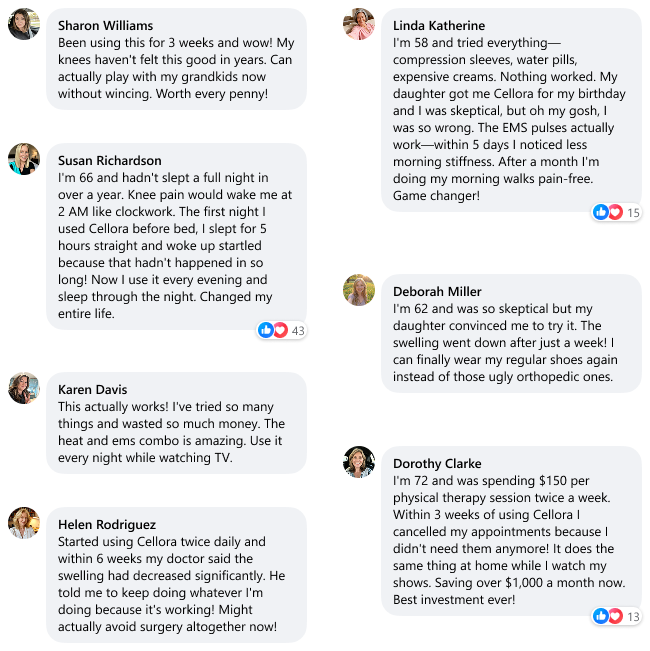 “I was skeptical at first — I’d tried everything from compression socks to elevating my legs and nothing worked long-term. But after just three sessions with Cellora™, my swelling visibly went down. My ankles no longer ballooned by evening, and for the first time in years I could actually get my feet into my shoes without forcing them. Total game-changer!”